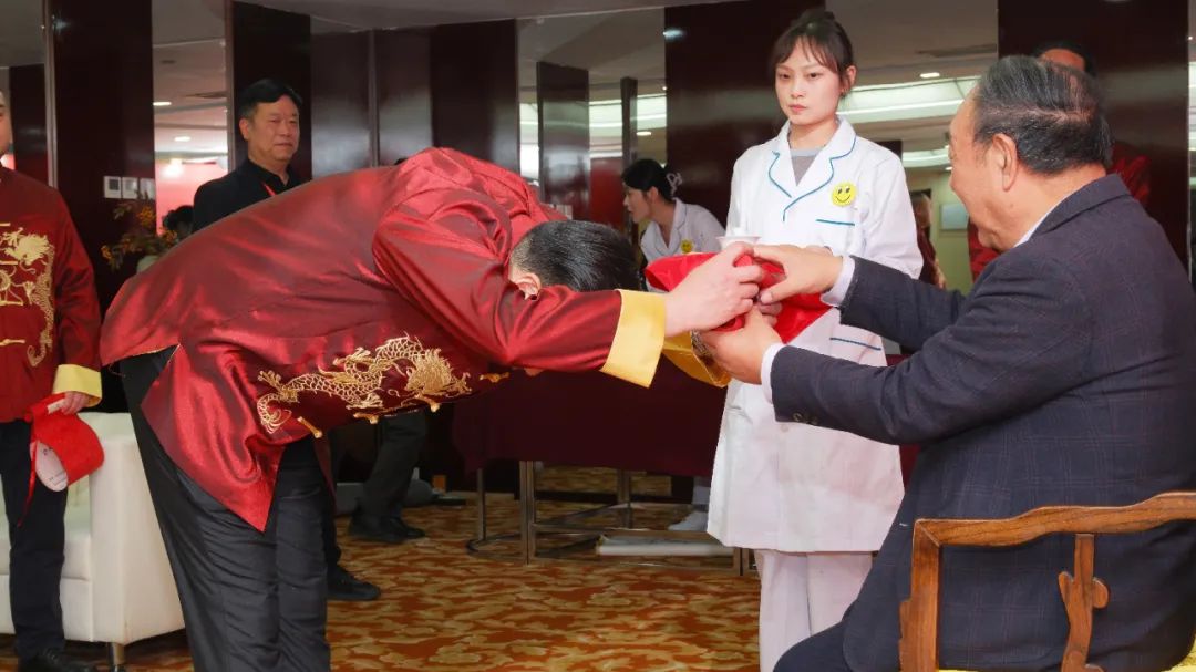 当天,郑州御和堂中医长王卫昌按中国传统中医礼仪向李老鞠躬行礼、呈递拜师帖、奉上敬师茶,李老为王卫昌颁发授徒证明并发表寄语,最后,师徒合影留念,拜师礼成。